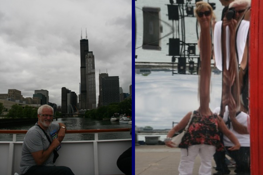 We got off the bus at Navy Pier which originally was to be a dock for freights, passenger traffic and a space for indoor and outdoor recreation for the public. Many events are held at the pier, such as expositions, pageants and other types of entertainment and is the number one attraction for tourists in Chicago. It was used for draft dodgers in 1918 and in 1927 was renamed Navy Pier to honour the naval veterans who served in the First World War. We walked the length of the pier and back before catching another bus into the center of Chicago where we saw the Magnificent Mile which is the location for several renowned buildings such as the John Hancock Center, Trump International Hotel and Tower, the Wrigley Building, Tribune Tower and the Chicago Water Tower. We saw the Willis Tower (formally known as Sears Tower) which when built in 1973 was the tallest building in the world and has the famous Skywalk on the 103rd floor where you can walk out on to the glass ledge and look down at the ground 1,353 below. We didn't go there but instead took a river cruise along the Chicago river which flows between some of the most attractive glass buildings as some of the photos demonstrate.