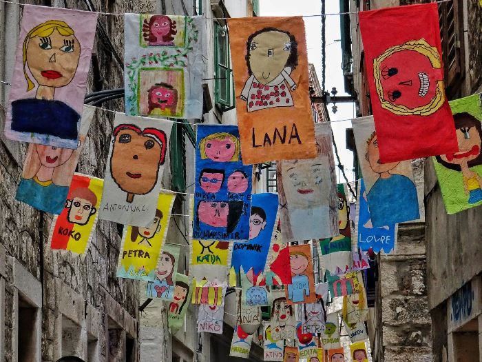 At the time we were there a youth event was taking place (not sure what or why) and there were many yachts out on the water and the local children had painted self portraits which were hanging from the various buildings lining the streets; we thought this was a really nice touch. There are some interesting churches which have withstood the ravages of time. The 15th century church of St. John, built in the Gothic-Renaissance style, has a staircase erected next to the south side of the church leading to the chancel which was made by a Šibenik artist, Ivan Pribislavić. An interesting place to visit, given more time, but we thought with three tours arranged for the same day, either this or preferably the Zadar tour in the afternoon could have been omitted.
