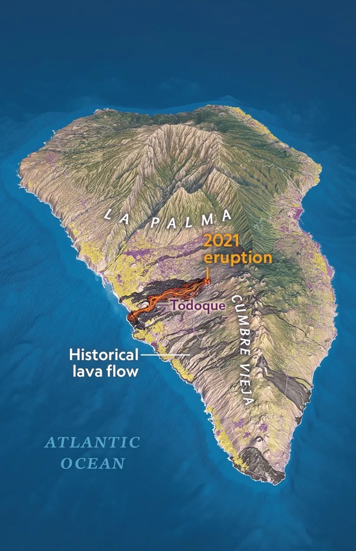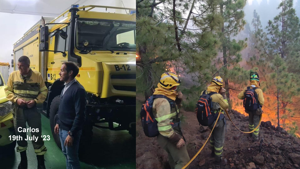 During the tour Carlos told us that he was an emergency firefighter but hadn't had to attend a fire for two years which is ironic as a week after we left La Palma they had a major bush fire on the west of the island and Carlos would almost certainely be fighting this fire now. I pinched a photo from his Facebook page just to prove it (Carlos in action). Carlos also took us to the Cumbre Vieja volcano that erupted between 19 September and 13 December 2021.(Map of Eruption) Apparently only one person died but the damage was extensive with the town of Todoque being completely destroyed. We saw the lava flow that had flowed down as far as the sea with the remains of a single house left in the middle.