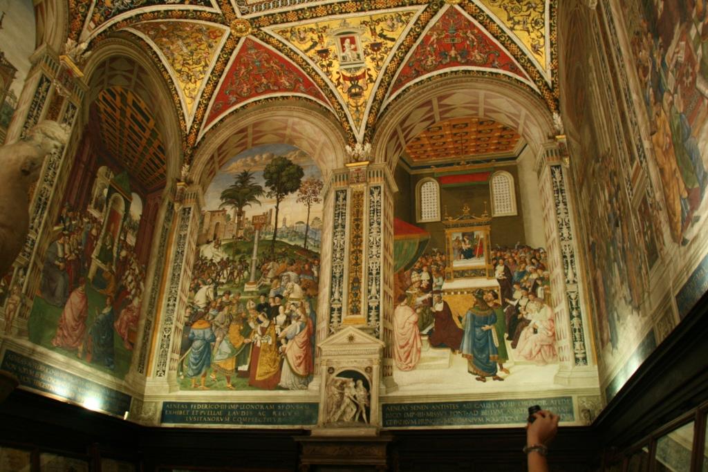 The dome and roof of the cathedral. Of course although the basic structure was built around 1250, most of the interior sculptures and paintings were done much later; the ceiling of the library (above right) is covered with painted panels of mythological subjects and painted between 1502 and 1503 by Pinturicchio and his assistants.