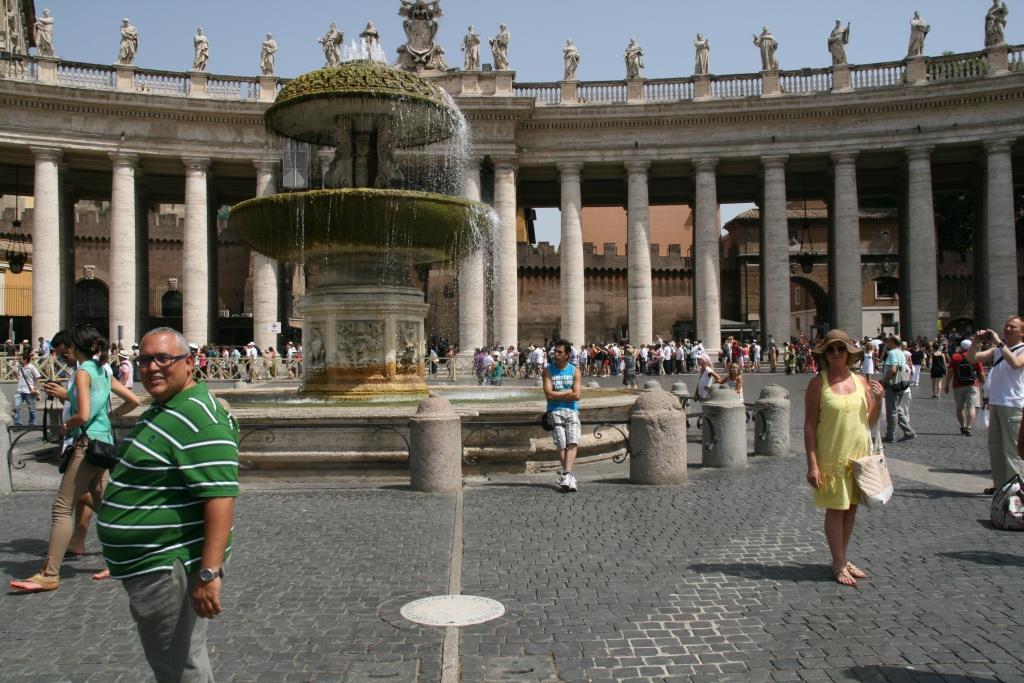 The Bernini fountain in the center of St Peter's Square. The colonnades in the background were built in 1660 and 140 statues created by Bernini and his students to depict popes, martyrs, evangelists and other religious figures were were installed on top of the colonnades.