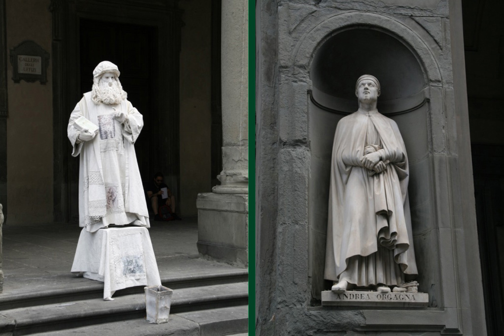 The statue on the right is of Andrea Orcagna (1308—1368) a prominent Florentine painter, sculptor, and architect of the mid-14th century, and the left statue is decidedly human who at the end of the day will pick up his 'stone' bucket with a few euros in it and go home for dinner.