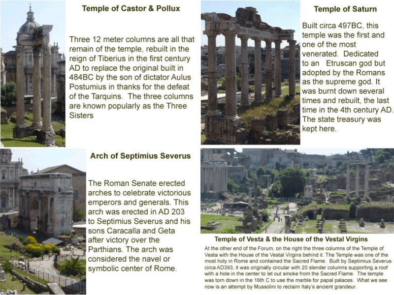 "Two of the main sights visible from our standpoint at the top of the Capitoline Hill, the Temple of Castor and Pollux on the left and the Temple of Saturn."