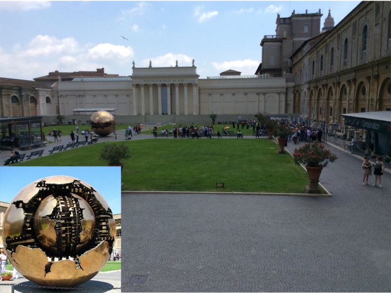 "This area is known as the Pine Cone Courtyard and at the far side is located the 'Sphere within a sphere' created by Italian sculptor Arnaldo Pomodoro who originally created it for the Vatican Church in the 1960s, but later began building them for other organizations and can now be found in prime locations all over the world, including Trinity College, Dublin and the UN Building in New York. I'm not sure of the relevance of this modern art amongst renaissance art."