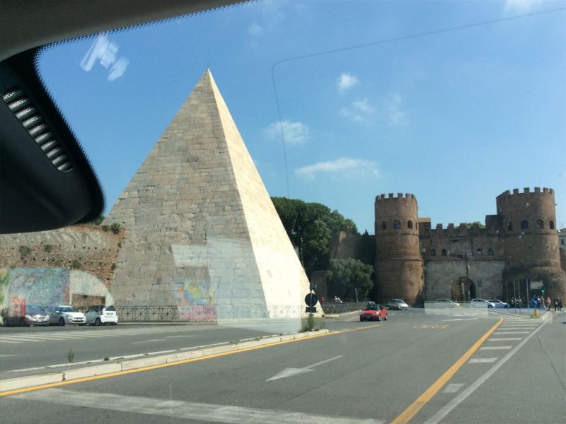 "This shot was taken through the window of the minibus (hence not so good) but shows the Pyramid of Cestius and the Porta San Paulo, formerly know as the Porta Ostiensis as it was at the start of the Ostia way from Rome to the port of Ostia. The Pyramid was built around 12 BC by praetor Caius Cestius as his tomb; it was built of concrete and brick and covered in Carrara marble; it was later integrated into the Aurelian Wall which helped to preserve it."