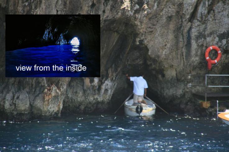 As we came round the west side of the island we were shown the famous Blue Grotto or Grotta Azzurra which is a sea cave where sunlight, passing through an underwater cavity and shining through the seawater, creates a blue reflection that illuminates the cavern. The entrance to the cavern is by small boat as the opening is only 2 metres wide by 1 metre high and as you can see the small boat has only one or two passengers and guide who have to duck low to get through; access to the cave can only be achieved at low tide Needless to say the nearest we got to the cave was this photo.